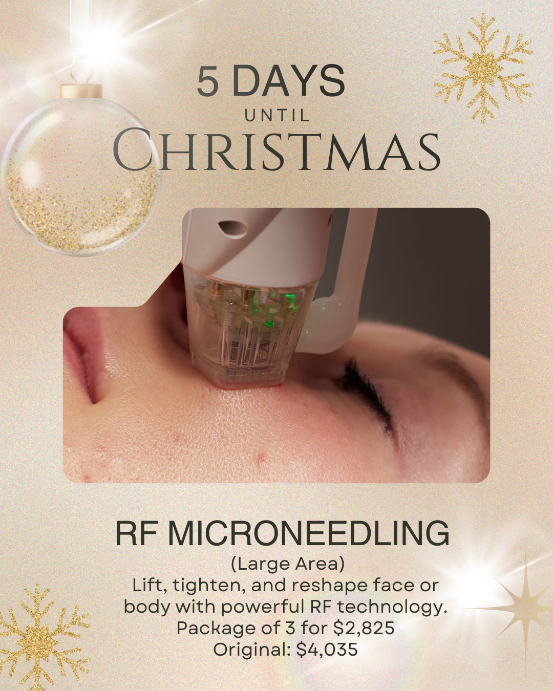 Boost firmness and contour with Day 5 — RF MICRONEEDLING (Large Area). This advanced treatment uses radiofrequency energy to lift, tighten, and reshape the face or body for smoother, more refined results.